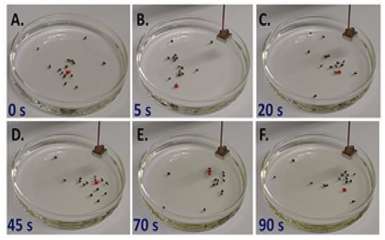 The panels (A–F) show the response of the flock to the introduction of a low-energy magnetic field at different times. The single sensor particle is highlighted in red. Reprinted with permission from Satterwhite-Warden, J.E., Kondepudi, D.K., Dixon, J.A. and Rusling, J.F., 2019. Thermal-and Magnetic-Sensitive Particle Flocking Motion at the Air–Water Interface. The Journal of Physical Chemistry B, 123(17), pp. 3832–3840. Copyright 2019 American Chemical Society.
