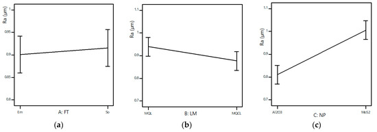 The interaction effect between fluid type and nanoparticle type (FT*NP): as shown in Figure 7b, the type of nanoparticles suspended in the based cutting oil changes the cooling and lubricating mechanism in the cutting zone. When using the MoS2 emulsion oil-based nanofluid, the surface roughness is smaller than that with the MoS2 soybean oil-based nanofluid. For Al2O3 nanoparticles suspended in soybean oil, Ra is smaller. The main reason is that MoS2 nanoparticles have a layered structure, so they easily form the tribo-film, contributing to the lubricating performance of the emulsion oil. Soybean oil has higher viscosity but a low ignition temperature, and when mixed with Al2O3 nanoparticles, its thermal conductivity improves. Combined with the good lubricating property of Al2O3 nanoparticles, this contributes to reducing the surface roughness [26]. Moreover, soybean oil has a chain fatty acidic structure, which contributes to its better lubricating characteristic than emulsion oil [29].