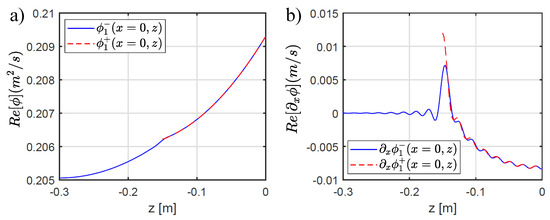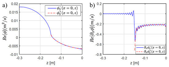 A numerical example calculated with , modes and is presented in Figure 7a,b, for the near field of and , respectively. Both fields, at the depth discontinuity, show a smooth transition between the deep and shallow water regions, confirming the convergence of the solution. The agreement of the multimodal matching can be verified more in detail in the vertical profile shown in Figure 8a,b, where an excellent match between the potential and the velocity at both sides of the step confirms the accuracy of the multimodal matching after applying the truncation method.