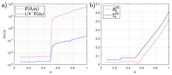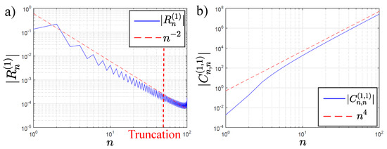 In this analysis, we focus on , which is the fastest growth in the double sum of Equation (45). Thus, we consider the term . In Figure 5a, we show the decay of the first-order reflection coefficient and the slope for comparison. We observe that for the case of , the decay is slower than for approximately. In contrast, as we observe in Figure 5b, the bound wave coefficient has growth at the power . Therefore, the decay of the first-order coefficients (, ) does not compensate for the growth of the bound evanescent wave constants, and some modification should be carried out to ensure the convergence of the second-order problem.