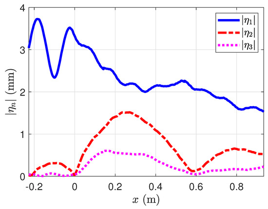 where T is the duration of the signal and is equal to an integer multiple of the wave period. The amplitude of the harmonics , and , for the experiment carried out at , is presented in Figure 12. As we observe, has a large modulation due to the step reflection in the region . In the region , we observe large attenuation due to experimental conditions, such as bottom friction or surface impurities. The second harmonic has a clear beating in the shallow region, suggesting the spatial interference of waves at different velocities. Eventually, the third-order harmonic has a non-negligible amplitude that can be interesting to take into account. However, considering that the multimodal model only solves the first and second order, we focus on these two problems, leaving the third order to a future study.