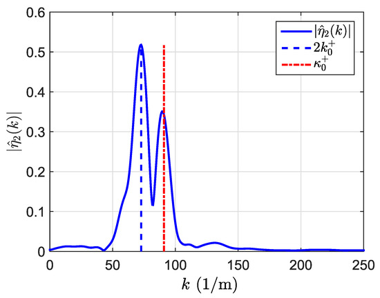 from which we can analyze the spatial spectral information at a given harmonic frequency . As an example, regardless of the spatial spectrum of the first harmonic that does not give any additional information, we show in Figure 13 the spatial spectrum of the second harmonic measured at . Interestingly, we clearly distinguish two maxima corresponding to the free and the bound wave that propagates at this frequency. As a reference, two vertical lines have been added. First, on the left side, the wavenumber corresponds to the bound wave, which is twice the wavenumber satisfying the dispersion relation of Equation (18), and second, on the right side, the wavenumber corresponds to the free wave, which satisfies the dispersion relation of the second order of Equation (49). The experimental separation of free and bound waves is limited by the spectral resolution (total length of the spatial domain). Regarding the amplitude of both maxima, the dispersion of the waves represented by the relative depth of the experiment determines the contribution of the free wave with respect to the bound wave. In the multimodal model, free waves are designed to ensure the matching of and once the bound wave field is calculated. We observe that the higher the relative depth is, the smoother the transition between both sides of the bound wave field is (particular solutions of the second order) and the smaller the contribution of the free waves field required to satisfy the matching conditions is. This trend shall be confirmed experimentally further on.
