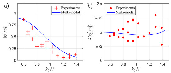 Next, we pass to the experimental validation of the theoretical waves and . From the space-time Fourier transform, we can extract at the frequency of the second order (), the complex values of the free and bound waves corresponding to the local maxima shown in Figure 13. The ratio between the amplitudes of free and bound waves () is plotted in Figure 15a as a function of the non-dimensional wavenumber . The theoretical curve was calculated with the same experimental parameters: m, m, m and . We observe the decay of the theoretical curve that is well verified by the experimental points that are, however, mostly below the theoretical curve. This overestimation of the theoretical ratio with respect to the experiments may be explained by the actual attenuation due to the experimental conditions. The fact that the theory only solves the second order may also overestimate the contribution of this order to the total solution. To complement, the phase difference () measured at the step position between the free and bound waves is plotted in Figure 15b. This phase difference, according to the multimodal model, should be close to , i.e., waves have opposite phases evolving slightly with the wavenumber. However, experimentally, the fact that the relative amplitude of the free wave decays as a function of the wavenumber means the signal-to-noise ratio is not sufficiently high enough to detect the free wave phase; thus, the experimental points are only accurately measured in the range .