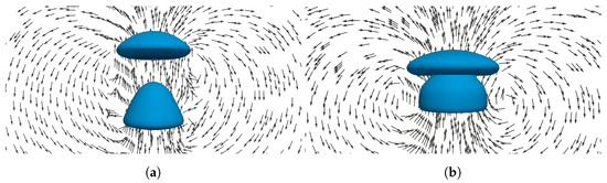 The last benchmark is the co-axial coalescence of two bubbles. The computational domain and the mesh used are the same represented, respectively, in Figure 8a,b, where M3 mesh was used (Table 8). The BCs and the numerical set up are also the same presented in Section 3.1.3. The second bubble, initialized using the setAlphaField utility, has the same diameter d as the first bubble shown Figure 8a and is positioned aligned with it with respect to the y-direction at a distance from its centroid equal to . The characteristic parameters for this case are: and .