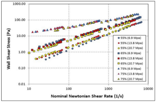 A recent research study introduces the idea of a primary and secondary effect of pressure on foam rheology. The primary effect occurs when the increase in pressure changes the foam quality, affecting the viscosity. Whereas the secondary effect is observed when the pressure increases, the foam quality is maintained. This is achieved by infusing pressurized gas into a fixed foam volume when the pressure is increased, and the system’s temperature is kept constant. This study highlights the significance of the secondary pressure effect by varying the pressure at 1000, 2000 and 3000 psi (6.9–20.7 MPa) while the foam quality is kept constant at 55%. The experiment is repeated for foam quality of 65% and 75%, and the result is shown in Figure 8. The overlapping points in the rheogram graph indicate that the increase in pressure does not affect foam rheology given that the foam quality is kept constant [55].