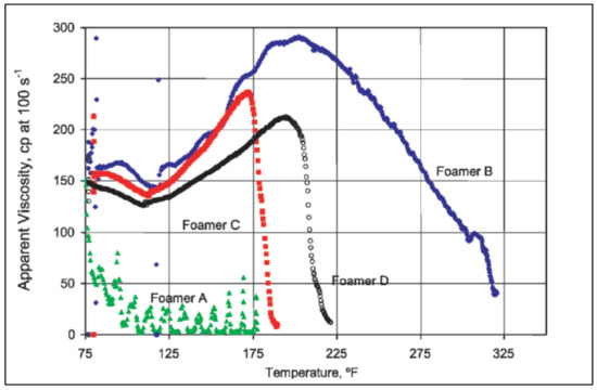 The change in foam viscosity as temperature increases (Reprinted with the permission from Hutchins & Miller, [29]). Copyright 2005, Society of Petroleum Engineers.