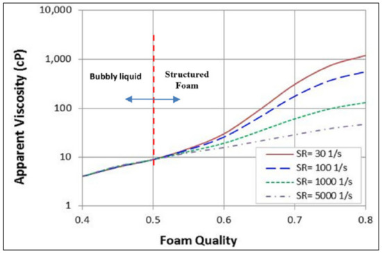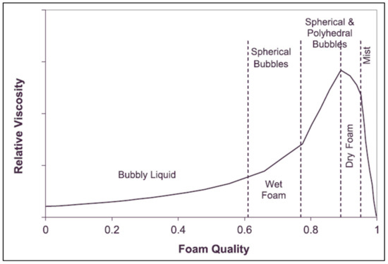 A considerable number of studies recognize the significant effect of foam quality on its rheology. These studies even suggest that foam quality is the most critical parameter influencing foam flow behavior [39,55]. Prior research claims that as foam quality increases, foam viscosity will increase up to a certain breaking point where the foam viscosity will decrease drastically [21,51,58]. This trend is depicted in Figure 12 below [51].