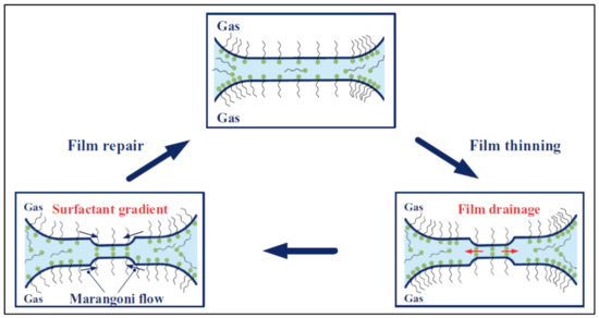 Apart from half-life, foam stability can also be observed visually by improving foam microstructure. Lv et al. (2015) [47] compared the stability of SDBS foam against SDBS foam with silica () nanoparticles addition over a 7-h. As observed in Figure 26, the structure of SDBS foam becomes coarser with irregular bubble sizes after 7 h, while the bubbles in /SDBS foam remain spherical in shape with thick liquid films. This phenomenon is associated with the permanent adsorption of nanoparticles on the bubble interface, which improves bubble’s viscoelasticity thus preserving foam stability [24].