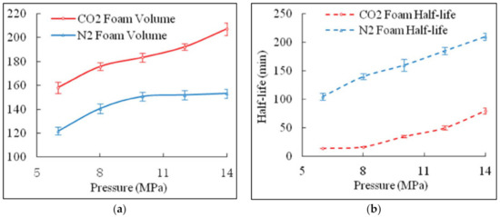 As temperature increases, the half-life of foam with or without nanoparticles will decrease, revealing increasing instability with temperature, as shown in Figure 6 [47]. However, there is still a need for research regarding foam stability at higher temperatures as this literature only assesses the stability of foam up until 90 °C.