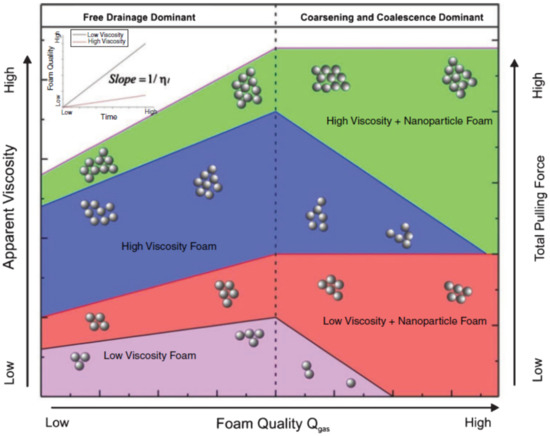 While some research has been carried out on foam stability, there is much less information available on the effect of nanoparticle on the rheology of foam fracturing fluid. It has been previously established that the use of nanoparticles can enhance foam viscosity [4,39,45,47]. Fei et al. (2018) [30] developed a chart shown in Figure 27 to visualize the performance of foam of low and high viscosity, with and without nanoparticles, against foam quality. The increase in viscosity with quality in the “free drainage” region is due to the interaction between particles, which will be boosted as the drainage occurs and gas fraction increases. However, as foam quality increases, coarsening and coalescence happen more frequently, thus reducing foam viscosity. The addition of nanoparticles can increase the foam viscosity in the drainage region besides maintaining the foam viscoelasticity in the coarsening and coalescence region, resulting in an overall higher viscosity and proppant-carrying ability compared to foam without nanoparticles.