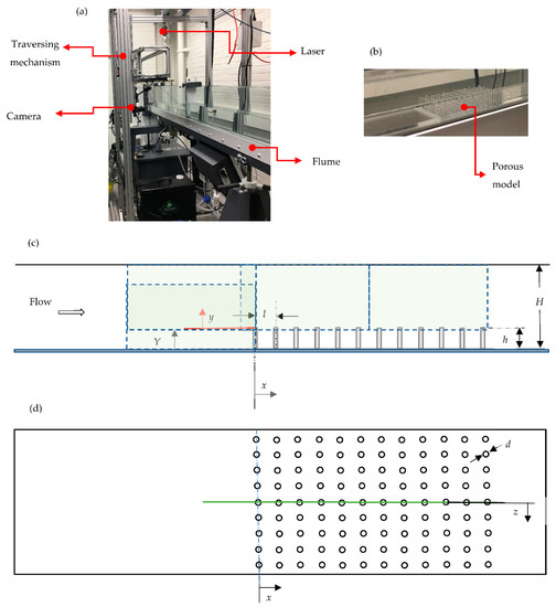The experimental set-up is made up of a model test channel, a porous medium model, a closed-circuit flow transport channel, and a planar particle image velocimetry (PIV) system. The entire set-up is depicted in Figure 1, along with a definition of the relevant Cartesian coordinate system employed.