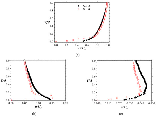 Each of the streamwise components of the entry mean flow data for the respective test conditions is plotted in Figure 2. In Figure 2a, this is performed in outer coordinates (with Ue and δ as the scaling parameters). Furthermore, as shown in Figure 2b,c, the relative background levels at the edge of the entry boundary layer is ~5%. This compares reasonably with values reported in zero-pressure gradient turbulent boundary layer studies [18]. The statistical relative uncertainties of the mean velocities, velocity intensities, Reynolds normal stresses, and Reynolds shear stresses were found to be no more than ±1.5%, ±2.0%, ±2.3%, and ±3.3% of their respective peak values.