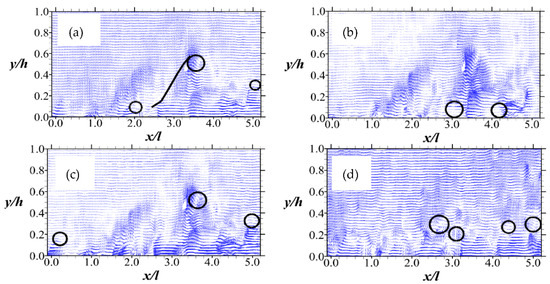 The identification of vortex regions has been one of the highlights of previous studies of turbulent flow over permeable boundaries (e.g., ref. [2]). This is because it provides important information about the size, reach, and motions of organized structures in a turbulent flow. With planar PIV data, one is able to visualize vortices on whole flow field vector maps through decompositional methods such as Galilean, Reynolds, and large-eddy simulation (LES) methods [22]. Examples of these are shown in Figure 3. With the Galilean decomposition, large-scale vortex cores are identified. Indeed, there are few indicators of hairpin vortices close to the permeable wall. This is shown in Figure 3a, where features such as the vortex head, inclined areas of ejection vectors, stagnation points, and inclined shear layer [29] are apparent. The small-scale vortices are more evident using the Reynolds decomposition and LES method. In Figure 3a–c, these features are compared for the same measurement taken at the same instant during Test A. Another sample Galilean decomposition is presented for Test B data in Figure 3d. Overall, these maps display a wide range of vortex cores, apparently within a wall-normal height of 60% of the porous medium depth h.