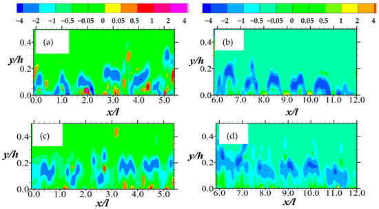 Contour plots of (from Equation (6)) for Quadrant 4 (Q4) events of the Reynolds shear stress normalized by the respective maximum mean streamwise entry velocity. Note that the hole size (i.e., D in Equation (6)) used is 0. The Q4 events are shown in (a,b) for Test A, and (c,d) for Test B. The legend all the plots are above (a,b).