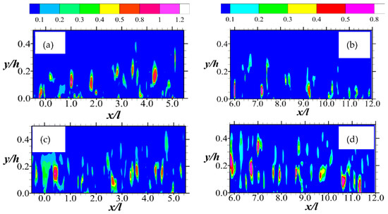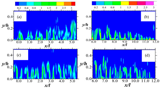While an important criterion for detecting vortex regions, vorticity maps are not able to distinguish between regions arising from pure rotation and those from shear. Thus, as outlined in Section 3.1, to show such distinctions of vorticity generation, eigenanalysis of the mean velocity gradient are used to retrieve the shear and swirling strengths. The results of these analyses are shown in Figure 5 and Figure 6, respectively, normalized by the maximum entry velocity and the rod diameter. Unsurprisingly, the contour plots in Figure 5 show that the dynamical generation of the vortex cores of the flow is mostly due to shear. The shear regions appear to extend from within the porous medium itself. For the case of Test A, the shear strength is highest at the very edge of the permeable boundary. This is indicative of the kind of high shear zones that tend to activate Kelvin–Helmholtz instabilities that lead to the formation of spanwise rollers [2,12]. It is also noteworthy that these shear regions are elongated and intermitted with thin regions of no shear. While these are certainly not the streaky structures associated with boundary layer flows of impermeable walls [29], they are reminiscent of them, and more so at higher Reynolds number flows. However, instead of being aligned in the streamwise direction, these ‘streaky’ structures associated with the shear strength are aligned in the wall-normal directions. In Figure 6, the regions of vorticity emanating from swirls are shown to be sparse and generally detached from the permeable boundary. However, at a higher Reynolds number, rotation becomes a more effective method of generating vorticity. These are the vorticities that peak off at a relatively higher wall-normal location compared to the others.