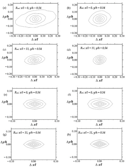 Following the methodology outlined in previous works [30,31], a more comprehensive assessment of the evolution of the average size and inclination of the correlation function contours is conducted. This is performed on the basis that such an assessment will provide an indication of the extent, shape, and orientation of structures such as hairpin vortices associated with turbulent boundary layers [24]. In order to study the wall-normal changes in size and inclinations associated with the autocorrelation functions, contours of Ruu and Rvv were obtained for different wall-normal positions (ranging from y/h = 0.04 to 1.54) per two fixed streamwise locations (at x/l = 0 and 11 respectively). The streamwise variations were studied by examining the contours of Ruu and Rvv retrieved from various streamwise locations (x/l = 0.10 to 11.80), for which the wall-normal location is fixed at y/h = 0.243 (i.e., close to the permeable boundary).