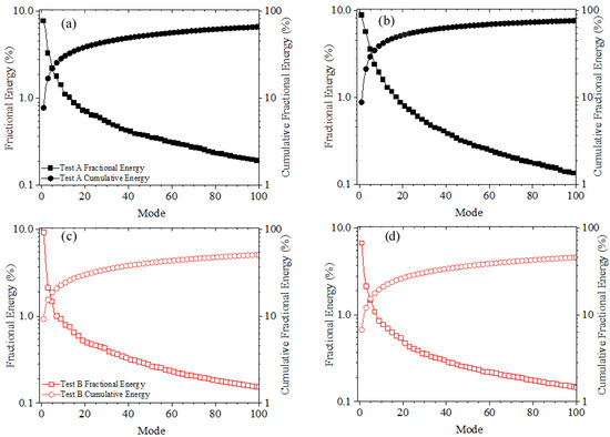 The energy contents of the low-order modes are shown in Figure 15. This is performed using the spectra of the fractional and cumulative energy contributions of the first 100 modes for the planes of measurement covering the porous boundary condition. The plots indicate an exponential decrease in fractional energy with increasing POD modes. The decay rates are generally greater in the case of Test A relative to Test B. However, the deviation in decay rates between the two tests is greater at 5 < x/l < 11. To illustrate this, for Test A, 50% of the total energy over the permeable boundary is captured by the first 41 modes and 18 modes at 0 < x/l < 5 and 5 < x/l < 11 respectively. For test B, 50% fractional energy is captured by the first 92 and 130 modes at 0 < x/l < 5 and 5 < x/l < 11 respectively. Overall, a substantial number of modes (~1550) are required to represent 90% of the fractional energy.