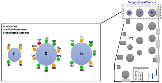 The present model simulates a real infection event of three unrelated families that occurred in a restaurant in Guangzhou, China, in January 2020. We labeled tables one, two, and three as table 1 (T1), table 2 (T2), and table 3 (T3), respectively and families sitting at these tables as family T1, family T2, and family T3, see Figure 1. The family members will be called customers. Figure 1 show the locations of the tables and the number of customers sitting around each table. During lunchtime, in addition to 8 staff members, there were 83 customers dining on the same floor of the five stories restaurant. One person in family B was already infected with COVID-19; however, he was asymptomatic when he dined with his family. After a few days, nine people sitting on tables T1, T2, and T3 were infected with COVID-19 even though some of them did not have direct contact with the sick person. The other customers sitting away from these three tables and the eight employees who were working on the floor at the time did not contract the virus. For the sake of simplicity, we labeled the customers as TXCYs (please, refer to Figure 1), where “X” represents the tables’ index and “Y” represents the customers’ number.