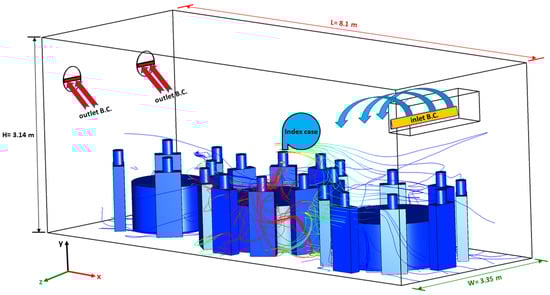 In the present model, human respiration activities, such as breathing, speaking, and sneezing within indoor environments, were simulated with CFD. CFD software AVL FIRE R2020 was used. Figure 2 illustrate the dimensions of the computational domain employed in the present model. The computational domain has dimensions of 3.35 m-width × 8.1 m-depth × 3.14 m-height. It was assumed that the ventilation of the computational domain was achieved through the air-conditioning unit in addition to the outlet area near the exhaust fans (please see Figure 2). The exhaust fans were not turned on, but the outlet area was open to the atmosphere.