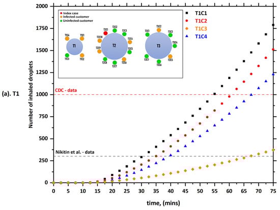 The number of inhaled droplets/particles by healthy individuals in a restaurant setting—case-1; (a) T1: table 1, (b) T2: table 2, and (c) T3: table 3 [].