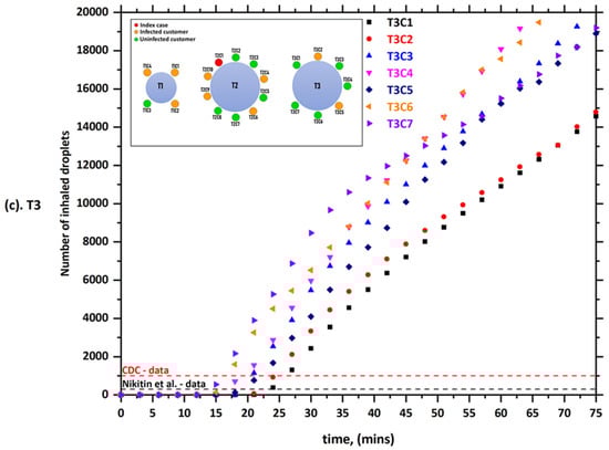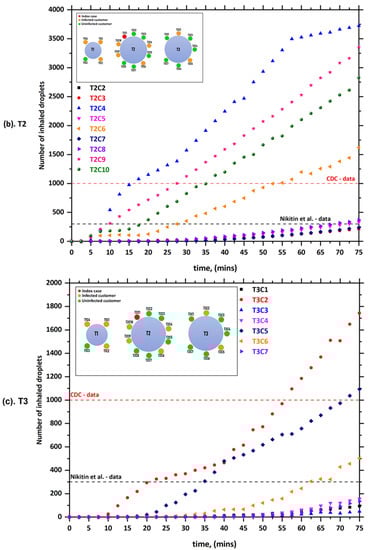 The number of inhaled droplets/particles by healthy individuals in a restaurant setting—case-2; (a) T1: table 1, (b) T2: table 2, and (c) T3: table 3 [].