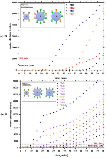 Figure 4 show the predicted results obtained by the current model of case-2. In case-2, it was assumed that the index case (T2C1) would sneeze a few times when t > 600 s. The main reason for focusing on sneezing in our model is the fact that sneezing happens to healthy people more frequently than coughing (episodes/day) every day []. Furthermore, it has the ability to spread infections and pathogens from asymptomatic carriers through the droplets that come out of the mouth during sneezing. The rate of air conditioning ventilation, in this case, was assumed to be similar to case-1 (0.9 L/s per person). Figure 4 show that there was a dramatic increase in the number of inhaled droplets by the other individuals in comparison with case-1. For example, T2C6 (i.e., the customer who was facing the index case (T2C1)) inhaled more than 300 droplets within less than 7 min and more than 1000 droplets within less than 12 min. These results were expected since a single sneeze can generate an order of 104 or more droplets []. In addition, we can note from the results that sneezes have a profound effect on the aerodynamics of the computational domain, where the velocity of a sneeze is about 20 m s−1 []. That means that the mixture of moist air and saliva that comes out of the mouth during sneezing will move straight and for a distance that may reach several meters.