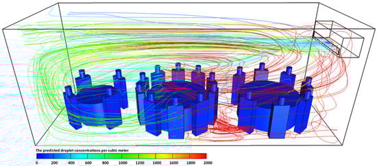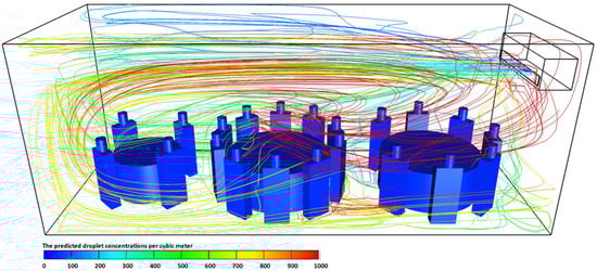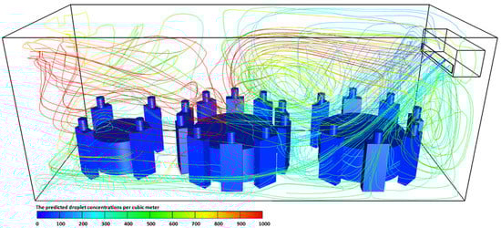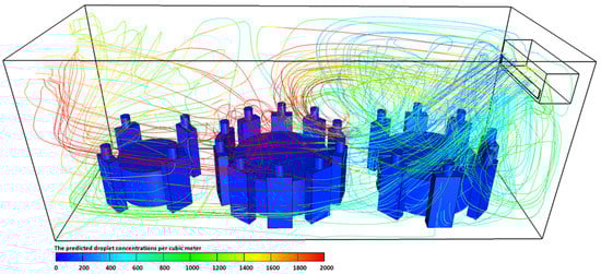 here is the density of air, is the density of droplets, dp represents the droplet diameter, and Vo is the terminal velocity. Gravity, which causes particle sedimentation, is regarded as an important physical mechanism for eliminating droplets from room air. The droplets’ size and their terminal velocity have a significant influence on this mechanism. The droplets’ size utilized in this study was 1 µm, and their terminal velocity was calculated at room temperature [,].