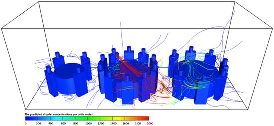 Figure 5 show the predicted results of droplet concentrations per cubic meter exhaled from the index case (T2C1) for case-1. Figure 5 show that the stream of exhaled droplets from the index case (T2C1) collides with the air stream of the air-conditioning unit. The high momentum air-conditioning stream pushes the contaminated air in the southward direction across all three tables, and then some of the air will be bounced off the wall back again in the direction of table 3 (T3). This air movement led to the circulation of aerosol particles inside the computational domain, and this explains the infection of the customers sitting at tables T1 and T3. The red color refers to a higher concentration of contaminated droplets in that part of the computational domain, which leads to an increase in the possibility of inhaling more contaminated droplets and thus increases the risk of contracting the infection. In Figure 6, we presented the number of droplets per cubic meter from case-2. As mentioned earlier in Table 1, the boundary conditions for case-2 are similar to case-1; however, we assumed that the index case (T2C1) would start sneezing for few times at t = 600 s. It can be seen from the data in Figure 6 that the air stream of the air-conditioning unit had almost a similar influence on the concentration of contaminated droplets. However, the main difference between the two cases (i.e., case-1 and case-2) was that the concentration of contaminated droplets in the area in front of the index case (T2C1) was higher compared with case-1. These results are likely to be related to the fact the carrier fluid flow (i.e., exhaled air) had a maximum velocity near the mouth of the index (T2C1) case during the sneeze, and this will assist the cloud of contaminated droplets to follow a straight trajectory and travel far away from the location of the infected person. However, the velocity of the stream of contaminated droplets will drop gradually. This will cause an increase in the concentration of contaminated droplets in the area in front of the index case (T2C1). Furthermore, it is well known that the size of droplets that are produced from coughing or sneezing is much larger than the size of droplets produced through speaking or breathing, which means they will settle quickly [,,,,]. However, these droplets from coughing or sneezing could travel for long distances and at high speeds, which may reach more than 8 m [,].