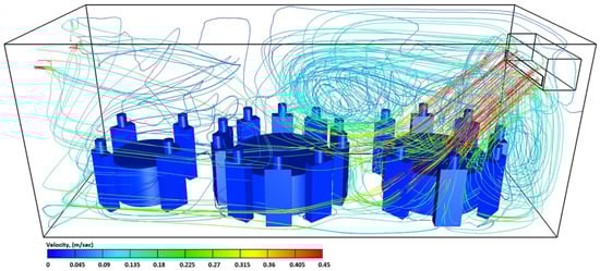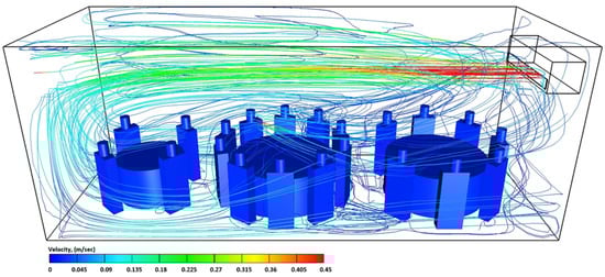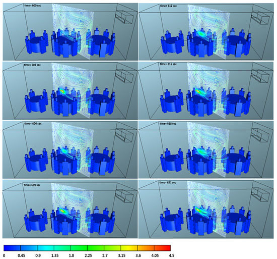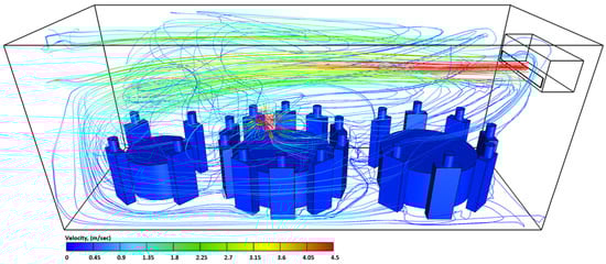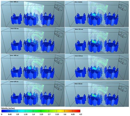The airflow streamlines velocities in the computational domain at t = 603 s for case-4.