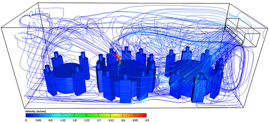 The airflow streamlines velocities in the computational domain at t = 4500 s for case-5.