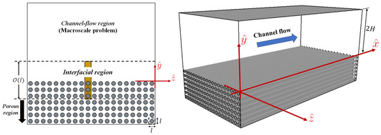 With the significant progress in manufacturing and fabrication techniques, the study of the interaction between the microscale features of the surface (such as roughness, porosity, irregularity, compliance, etc.) and the adjacent fluid flow has become more important for several applications. The numerical complexity of fully resolving the micro-details of the surface in Direct Numerical Simulations (DNS) or even in Large Eddy Simulations (LES) of turbulence represents a challenge, especially if optimization of the surface is the ultimate goal. The multiscale homogenization approach adopted in this paper is a mathematical framework through which the rapidly varying properties of the surface (the porous substrate in the present case) can be replaced by upscaled properties such as slip, interface permeability, etc. [32,33], which contribute to the definition of effective boundary conditions at a virtual plane surface. The macroscale behavior of, for instance, the turbulent channel flow is then targeted, bypassing the need to fully resolve the motion within the permeable substrate; the mesh requirements of the numerical simulations are therefore significantly alleviated. Multiscale homogenization has been known and used by applied mathematicians for a long time. In more recent years, it has been rediscovered and applied to a variety of physically relevant cases. Although the classical first-order slip condition over a generic solid surface, proposed by Navier [34], was based on empirical considerations concerning the near-wall flow behavior, recent studies adopting the homogenization technique have provided a robust mathematical framework for the estimation of Navier’s slip length, , without the need for any ad hoc correlation [35]. A tensorial generalization of the first-order Navier’s slip condition over a micro-textured surface was given by Zampogna et al. [36], via the definition of a third-order slip tensor which depends on the geometry of the roughness pattern. The homogenized model was later extended to study the fluid motion over deformable riblets, to assess the potential drag reduction [37]. The so-called transpiration-resistance model by Lācis et al. [38] shed light on the role of the wall-normal velocity at the fictitious interface in improving the predictions of the homogenization-based direct simulations for turbulent flows over micro-patterned surfaces. The homogenization model for the flow over a rough surface was later pushed to third-order in terms of a small parameter, ratio of microscopic to macroscopic length scales, by Bottaro and Naqvi [39]. Most recently, the asymptotic homogenization theory has been employed by Ahmed et al. [40] to study buoyancy-driven flows over vertical rough surfaces, by deriving and implementing upscaled velocity and temperature boundary conditions at a smooth virtual surface. Effective boundary conditions at the interface between a porous bed and an unconfined flow region have been explored by Sudhakar et al. [41] and by Naqvi and Bottaro [42].