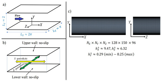 The governing equations are discretized with the finite volume method, as by the implementation of the Simcenter STAR-CCM+ multiphysics software (version 16.02.009-R8). The hybrid MUSCL 3rd-order/central-differencing scheme was employed for spatial discretization. The scheme combines boundedness and accuracy; under smooth local flow conditions, it is formulated as a linear blend between a MUSCL 3rd-order upwind scheme and a 3rd-order central-differencing scheme, with an upwind blending factor equal to 0.1. The reader is referred to [43] for details on the MUSCL/CD approach. A structured three-dimensional grid was generated (Figure 5c). The mesh is uniform in streamwise and spanwise directions, where the respective spacings of the grid (in wall units) are and . The grid is gradually stretched in the wall-normal direction to obtain thinner elements near the walls () and thicker near the centerline (). A second-order implicit scheme was used for temporal discretization. To maintain the maximum Courant number below 1, a time step of 0.0015 was applied (the time scale is ). The SIMPLE algorithm was used for pressure-velocity coupling.