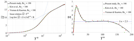The distribution of the mean streamwise velocity () is displayed in Figure 6 as a function of the normal distance (Y) from the lower wall. It is clear that the present numerical results for agree well with the reference results by Vreman and Kuerten [4] and Kim et al. [44]. For instance, the value of the centerline velocity is equal to 18.3, compared to approximately 18.28 in [4] and 18.18 in [44]. The velocity profile is plotted in wall coordinates in Figure 7-left; . The behavior fits well with the linear relation in the viscous sublayer (up to ), while the log law, , is satisfied for . Here, the von Kármán constant () is , while a value of was chosen for the intercept of the logarithmic profile (B) to take into account the low Reynolds number effect [44]. The behavior of the log-law diagnose function, defined as , is shown in Figure 7-right. The constancy of indicates, by definition, a typical logarithmic behavior of , where the constant value corresponds to the coefficient . It is clear that the upper validity limit of the log-law is .