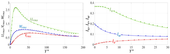It is useful for both validation and physical interpretation purposes to analyze the primary fluctuations (), representing the instantaneous deviations of the velocity components from their time-averaged values; for example, . The intensity of the fluctuations can be described by the root-mean-square () values (), where , for example. Another measure is the intensity of the fluctuations (). The behaviors of both estimates (, I) are show in wall coordinates in Figure 8, together with reference data from [4,44]; the accuracy of the present results is confirmed.