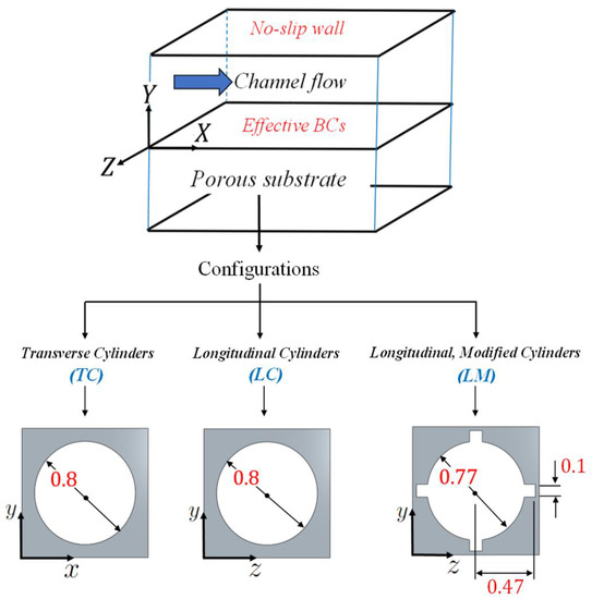 The turbulent channel flow over porous substrates of different microstructures is macroscopically analyzed in this section, with the aid of the homogenization model described in Section 2. The numerical procedure, including the spatial and the temporal discretization schemes and the momentum forcing term, is identical to the setup of the smooth channel case, described in Section 3.1.1. The only modification is that the lower boundary (at ) now mimics a slip, permeable wall. This can be achieved by implementing the effective boundary conditions for the three velocity components given in Equations (25)–(27), with model coefficients corresponding to the specific topology and orientation of the solid inclusions sketched in Figure 11. Focus is on the evaluation and the further interpretation of the favorable/adverse changes in the skin-friction drag, related to the presence of different anisotropic permeable substrates. It is important to highlight that the geometries of the inclusions described in Figure 11 are intentionally chosen to meet this objective. The inclusions considered are: (i) transverse, Z-aligned, cylinders (configuration: TC); (ii) longitudinal, X-aligned, cylinders (configuration: LC); (iii) longitudinal cylindrical elements modified with four longitudinal protrusions in the shape of parallelepipeds, equally spaced along the circumference (configuration: LM). The dimensions of the solid inclusion within the unit cell are chosen to yield the same porosity, . The model coefficients for substrate LC have been estimated earlier; they are given in (24). The coefficients for the case of spanwise-aligned cylinders (TC) are directly available from the LC case, by simply switching the streamwise and spanwise coordinates, i.e.,