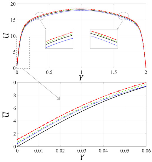 The numerical solutions of the auxiliary sub-systems related to the problem, i.e., Equation (15), reveal that and are the only variables which do not vanish at the matching surface (). The contours of the two parameters throughout the microscopic domain are displayed in Figure 2; for brevity, fields of the other variables are not presented. Subsequently, the effect of varying the location of the matching interface was considered, by gradually increasing the value of and monitoring the behaviors of and . Linear trends have been detected, in the same manner as for the case of the fluid motion over a rough surface [39], i.e.,
