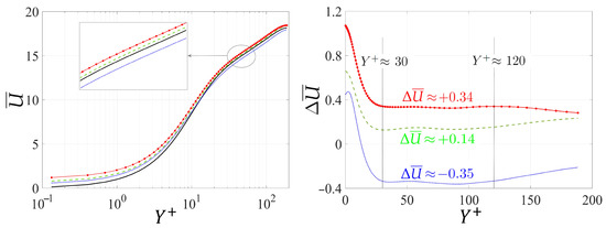 with B the intercept in the case of a smooth wall, and the shift of the velocity profile from the corresponding smooth channel behavior. The variations in across the boundary layers over different substrates are shown in the right frame of Figure 13. As expected, the logarithmic regions () are characterized by approximately constant values of (corresponding to parallel profiles of ); which can be directly linked to the deviations of the skin-friction drag coefficients from the smooth channel case; a positive value of implies drag reduction (as for substrates and ), and vice versa for substrate .