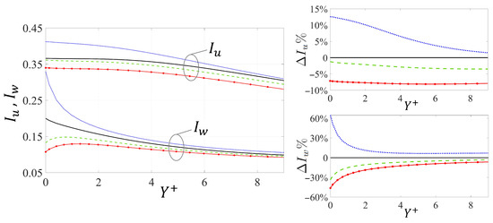 Turbulence intensities ( and ) near the permeable walls. In the right frames, the percentage deviations of the intensities from the reference smooth channel values are displayed. Symbols are identical to those in Figure 14.