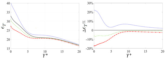 The distributions of the turbulence intensities and are shown in Figure 16 in the neighborhood of the permeable walls, i.e., up to . Interestingly, the behaviors of these quantities, even at the permeable wall and within the adjacent viscous sublayer, are strongly linked to the corresponding changes in the skin-friction drag. The same concept applies to the turbulence dissipation (), displayed in Figure 17. For instance, the drag increase in the case of the substrate is associated with increase in the interfacial values (at ) of , and by about , and , respectively, whereas these parameters decrease by about , and for the substrate . This should be compared to the RMS of the velocity fluctuations, which proved to be representative of changes in the skin-friction drag coefficient only in the log-law region.