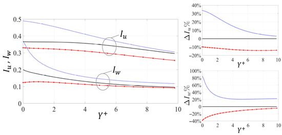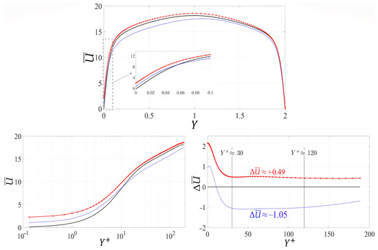 The profiles of the mean streamwise velocity () over the permeable substrates and are displayed in Figure 18. It is clear that the positive/negative deviations () in the intercept of the logarithmic profile (cf. Equation (42)) are accentuated with respect to the corresponding cases with (cf. Figure 13); this goes along with the larger changes in the drag coefficient at . In agreement with the previous discussion in Section 3.2.2, the turbulence intensities, presented in Figure 19, provide a fair clarification of the levels of disturbances in the near-wall layer, which can justify the adverse/favorable changes in skin friction coefficient for substrates and , respectively.