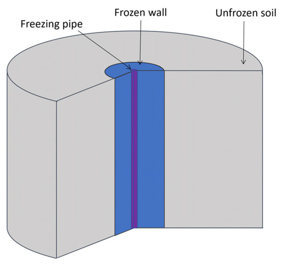 The process of soil freezing using one vertical freezing pipe was modeled (Figure 2). The pipe has a cylindrical shape, a constant radius, and a sufficiently large height. It was assumed that the considered horizontal clay layer in the vertical direction is sufficiently extended in all directions, and therefore the effect of vertical heat transfer on the temperature field of the middle section of this layer is negligibly small. The temperature of the brine moving in the freezing pipe has a uniform distribution. The soil is modeled as a homogeneous and isotropic material, and heat transfer only occurs due to thermal diffusion. Water in the pore space of the soil can transit from a liquid to a solid state, which is accompanied by the release of heat. In addition, local thermodynamic equilibrium of the phases at each point of the medium was assumed. The effect of supercooling of pore water was not considered. Due to the geometric symmetry in the physical properties and in the freezing pipe, it is sufficient to consider the change in the thermophysical properties of the frozen medium in only the radial direction. In this case, the non-stationary temperature field in the clay layer is described by the energy balance equation in the following form [31,32]: