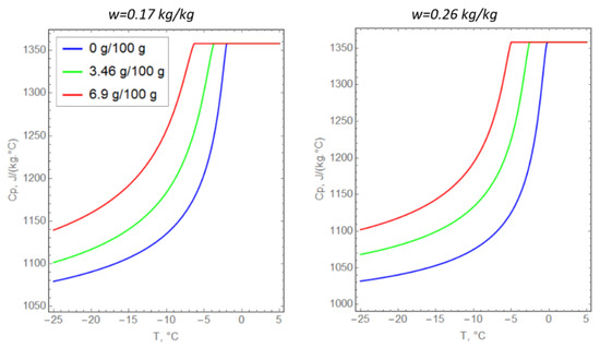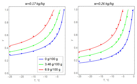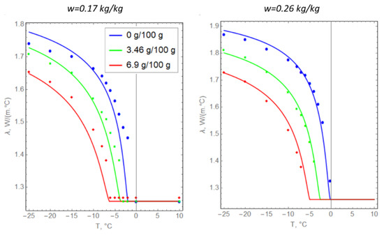 The temperature dependences of the volume fraction of unfrozen water were used to determine the dependences for specific heat capacity and thermal conductivity [36,37]: