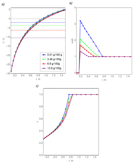 In general, a natural result was obtained—with an increase in the initial salinity, pore water requires lower temperatures to freeze, known as freezing point depression. If the soil is more saline, then less heat must be removed from it to reduce its temperature by a given value, and a larger amount of unfrozen water remains in it. For this reason, the red temperature curve, corresponding to the highest salinity, is below the other three curves. The T(r) curves for the four salinity concentrations differ from each other by a maximum of 1.5 °C, which is significant. The maximum mismatches are observed at the beginning of the pore water crystallization. At the same time, the temperature differences are minimal near the freezing pipes, which is apparently due to the large thermal effect of the boundary condition, as expressed in Formula (14). The differences between the T(r) curves increase with an increase in the initial water content of the soil.