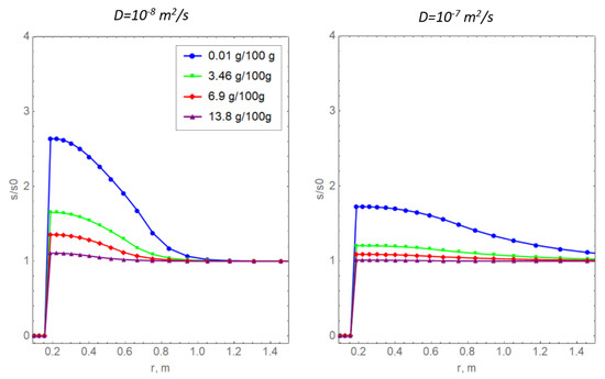 Radial distributions of the relative salinity of pore water for two values of the diffusion coefficient of the dissolved salt and various values of initial salinity.