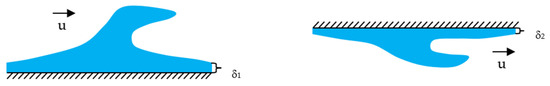 A schematic representation of liquid ‘roll wave’ and film thickness in a horizontal circular pipe: the bottom wave propagation (left) and up wave propagation (right). Parameter δ represents the liquid film thickness and u is flow velocity.