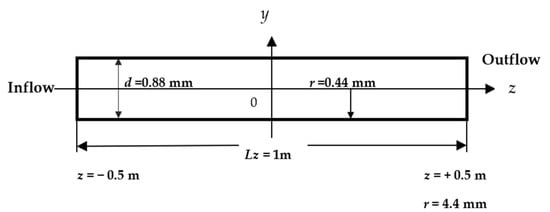 Figure 6 depicts a schematic view of the computational domain, illustrating a 2D cross-section through the centre line of a straight horizontal 3D circular pipe. The pipe is 1 m in length and 8.8 mm in diameter, the same as that used in the experiments of Schubring and Shedd [9,10,11,12].