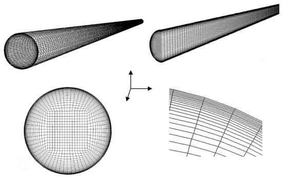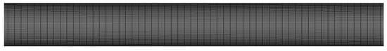The grid convergence study was carried out considering a 2D computational domain. It was found that a grid of 100 × 88 points is required to achieve numerical solutions which are independent of grid points. Figure 7 displays a Cartesian structured mesh, uniformly distributed in the streamwise (z) direction and stretched (with a stretch factor of 6) in the wall normal (y) direction, respectively. The maximum skewness factor was determined at 2.4 × 10−4, confirming a good mesh quality obtained. The air flow was of turbulent status as the flow Reynolds number 6466 for the wavy annular flow and 17,587 for the full annular flow, respectively. However, the annular liquid film was of laminar status as the estimated Reynolds number was below 2022. In this respect, the near-wall grid resolution was fine-tuned to satisfy the requirement of chosen SST k-ω turbulence model.