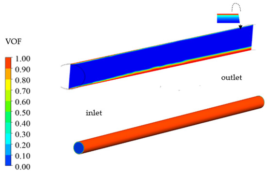 The asymmetrical wavy flow pattern around the pipe top/bottom walls (see Figure 10c,d) may be attributed to the buoyancy induced flow instability, combined with the strong interfacial shear stress at the air and water interfaces. The water wave gradually became smoother (see Figure 10e) due to the increase in the ratio of air and water superficial velocity. The water VOF distribution indicated that the air was mainly at the central (core) part of the pipe. The entrainment of air into water (liquid) regime, as depicted by the air ‘pockets’ at the front of the water slug, was predicted at a time of 0.705 s, consistent with the observed bubbly flow transition to slug flow, followed by the development of wavy annular and full annular flows characterised by the water film coated around the top and bottom pipe walls (see Figure 10c–f). The tendency of the air and water two-phase flow pattern transition predicted by current study is in qualitatively good agreement with the findings of another similar study [51].