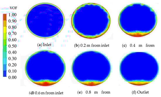 Contours of the liquid film distributions at six successive cross-sections from the inlet to the outlet, represented by the water volume of fraction (VOF). (a) Inlet; (b) 0.2 m away from inlet; (c) 0.4 m away from inlet; (d) 0.6 away from inlet; (e) 0.8 m away from inlet; (f) outlet, respectively.