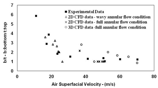 The liquid (water) film thickness ratio at the bottom/top walls (b/t) is presented as a function of the air flow superficial velocity. The water base film thickness at the top/bottom pipe wall is determined by the distance from pipe wall to air and water interface, respectively, and it is averaged over the time in the streamwise flow direction. The 2D CFD results with full annular flow condition were in better agreement with the experimental data, especially at high air flow superficial velocity regime than 3D CFD prediction with the same conditions. Both experimental measurements and 2D simulation results showed a trend of symmetrically distributed top and bottom liquid film distributions at a high air flow superficial velocity regime. On the contrary, the 3D CFD prediction exhibited an asymmetrical distribution of the liquid film. This finding is in qualitatively good agreement with that of Abdulkadir et al., who previously observed a similar tendency in their air–water two-phase flow experiment, using a large pipe [52].